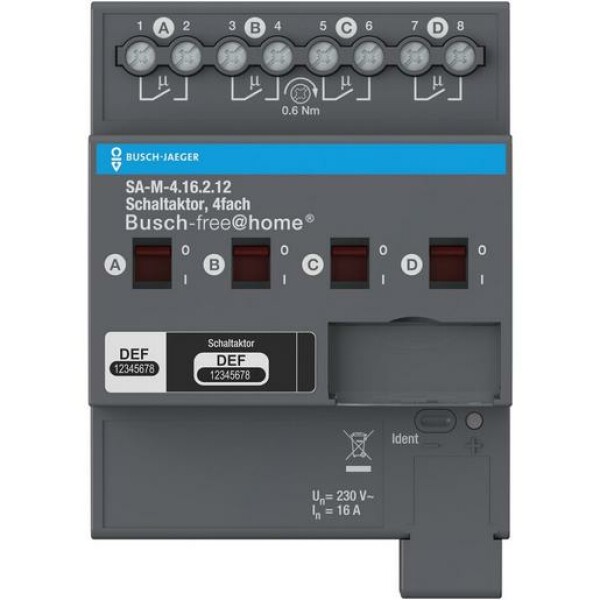 Schaltaktor 4-fach für Busch-free@home. Schaltet mit 4 unabhängige potenzialfreien Kontakten elektrische Verbraucher über Busch Free@Home. Für jeden Ausgang ist die Handbedienung des Kontakts möglich. Der Schaltzustand des Kontakts wird angezeigt. Die 16A-Standard Reihe ist geeignet zum Schalten von ohmschen Lasten (AC1).