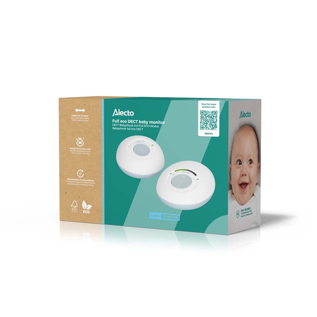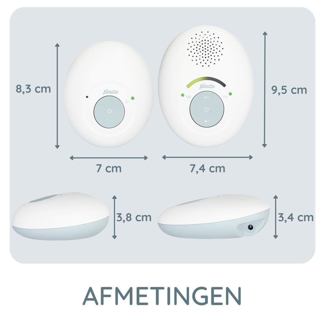 • In den Farben weiß und blau erhältlichDieses einfache DECT-Babyphone bietet Ihnen alle Funktionalitäten, die Sie brauchen. Die Sicherheit, dass Ihr Kind entspannt schläft. Eine 100 % störungsfreie Verbindung, worauf Sie immer vertrauen können. Sehr klare DECT-Klangqualität, sodass Sie immer hören, wenn das Kleine wach wird (oder süß babbelt) und natürlich Lampen, an denen Sie sehen können, ob Ihr Kind Geräusche macht. Sie erhalten zusätzlich eine Meldung, wenn die Batterie beinahe leer ist, oder wenn die Elterneinheit außer Reichweite ist. Mit einer Reichweite von bis zu 50 Metern Innen und bis zu 300 Metern Draußen, können Sie guten Gewissens im und um Haus Ihre Sachen erledigen.Einfaches DECT-Babyphone, mit SparbetriebBeschäftigen Sie sich aktiv mit Energiesparen? Dann treffen Sie mit diesem Babyphone die richtige Entscheidung, dank des Sparbetriebs. Damit sparen Sie nicht nur Energie, aber wählen Sie auch ein Produkt mit minimaler Strahlung. Im Standby-Modus haben Sie sogar überhaupt keine Strahlung.Das einfache DECT-Babyphone vom Marktleiter AlectoDie Babyphones von Alecto sind die auf dem Markt am besten verkauften. Mit über 40 Jahren Erfahrung wissen wir genau, was Eltern sich von ihren Babycare-Produkten erwarten. Wie die DECT-Klangqualität. DECT steht für Digital Enhanced Cordless Telecommunication. Dies ist der Standard in Europa, Asien, Amerika und Australien, wegen:• der klaren DECT-Klangqualität