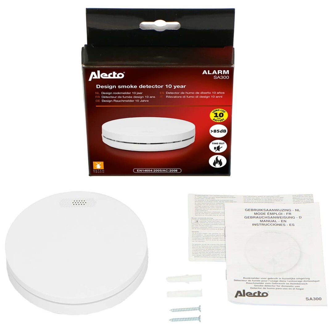 Der Alecto SA300 Rauchmelder ist extra dünn und hat ein elegantes und unauffälliges Design. Mit einer Dicke von nur 3 cm und einem glatten, eleganten Finish fügt sich dieser kompakte Rauchmelder mühelos in jede Einrichtung ein. Wenn im Haus Rauch oder Feuer ausbricht, schlägt der Melder schnell Alarm. Ein lauter Alarm, den Sie sicher auch im Schlaf hören werden.Lebensdauer 10 JahreDieser schlanken Designrauchmelder verfügt über eine Lithiumbatterie, die 10 Jahre hält. Energieeffizient und zuverlässig. Der hochwertige optische Sensor hat zudem eine Lebensdauer von 10 Jahren und sorgt dafür, dass Sie sofort alarmiert werden, wenn es in Ihrer Wohnung raucht oder brennt. Zu der langen Betriebszeit des Rauchmelders, geben wir auch 10 . Wenn die Batterie schwach ist, erhalten Sie eine Warnung.Große Hush, Test- und Reset-TasteDer Alecto SA300 verfügt über eine große, aber unauffällige Test- und Reset-Taste. Die gesamte Oberfläche ist ein einziger großer Knopf, den Sie einfach mit der Rückseite eines Besens drücken können. Sie müssen nicht auf einer Leiter stehen, um den Melder zu testen, den Melder auszuschalten oder den Alarm zu deaktivieren.• Hush Taste• Rauchmelder sollten regelmäßig getestet werden. Drücken Sie die Testtaste einmal im Monat und immer nach einer Zeit der Abwesenheit.Einfache InstallationDieser kompakte Rauchmelder von Alecto ist für die Wand- und Deckenmontage geeignet und lässt sich einfach an der gewünschten Stelle installieren. Im Lieferumfang sind eine Grundplatte, Schrauben und Dübel enthalten, um die Sache noch einfacher zu machen. Sobald der Rauchmelder auf die Montageplatte geklickt wird, wird der Melder aktiviert.Die besten Orte für die Platzierung von Rauchmeldern sind im Flur oder auf dem Treppenabsatz. Diese sind oft die Fluchtwege im Haus, wenn ein Feuer ausbricht. Wenn Sie maximalen Schutz wünschen, hängen Sie in jedem Raum, in dem ein Feuer entstehen kann, einen Rauchmelder auf.Der SA300 ist auch in einem Set mit 2 Rauchmeldern erhältlich, dem SA300 DUO.Wesentliche Merkmale• Schnelle Warnung vor Rauch und Feuer