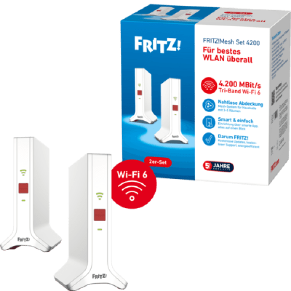 FRITZ!Repeater Mesh Set 4200. Maximale Datenübertragungsrate: 4200 Mbit/s. Antennen-Design: Intern, Antennentyp: 2x2/4x4. WLAN-Band: Dual-Band (2,4 GHz/5 GHz), Top WLAN-Standard: Wi-Fi 6E (802.11ax), WLAN Datentransferrate (max.): 4200 Mbit/s. Schnittstellentyp Ethernet-LAN: Gigabit Ethernet, Netzstandard: IEEE 802.11a, IEEE 802.11ac, IEEE 802.11ax, IEEE 802.11g, IEEE 802.11n, Verkabelungstechnologie: 10/100/1000Base-T(X). Übertragungstechnik: Kabelgebunden