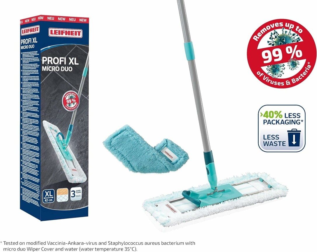 - Lieferumfang - Leifheit Bodenwischer Profi XL mit 3-tlg. 146 cm (Demontage nach Aufbau nicht mehr möglich), 1x Mikrofaser- & 1x Anti-Staub Wischbezug, umweltfreundliche Verpackung, Art. Nr. 55170