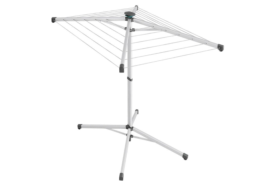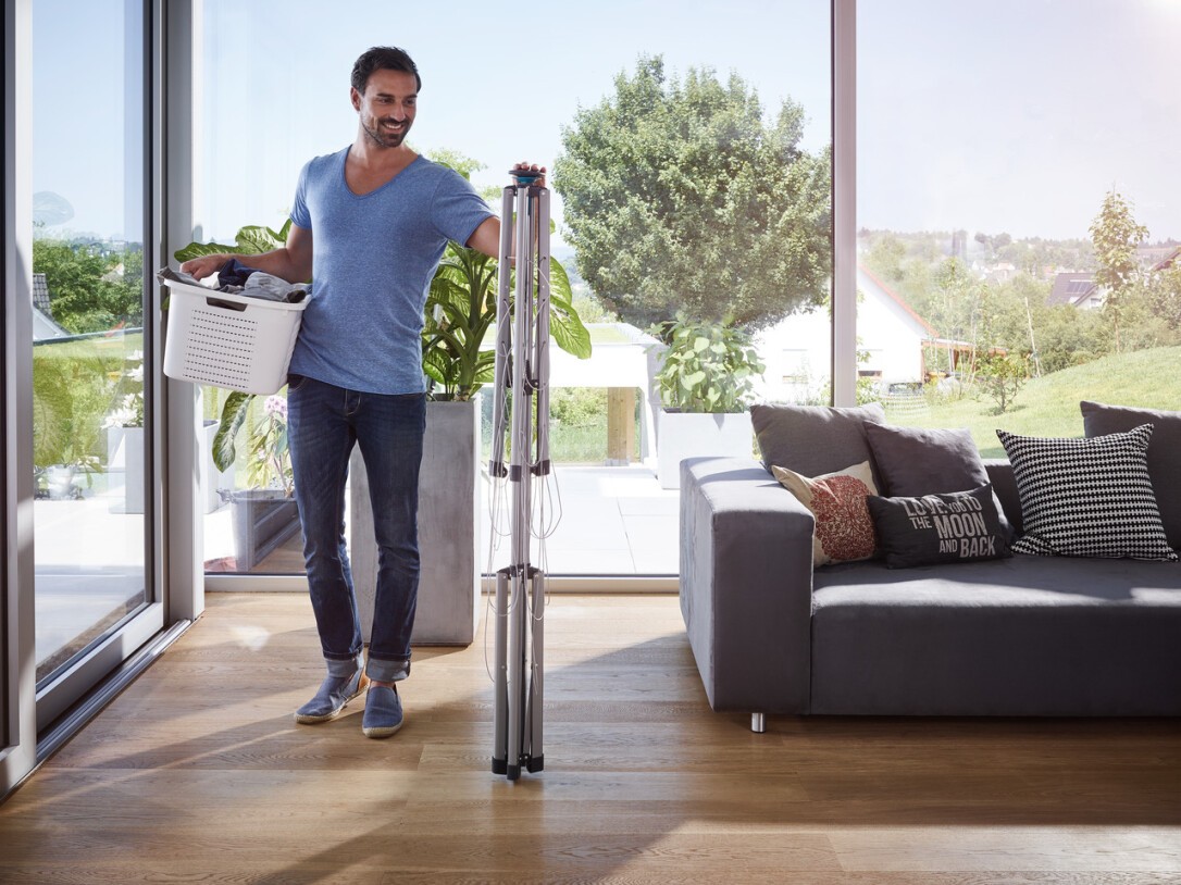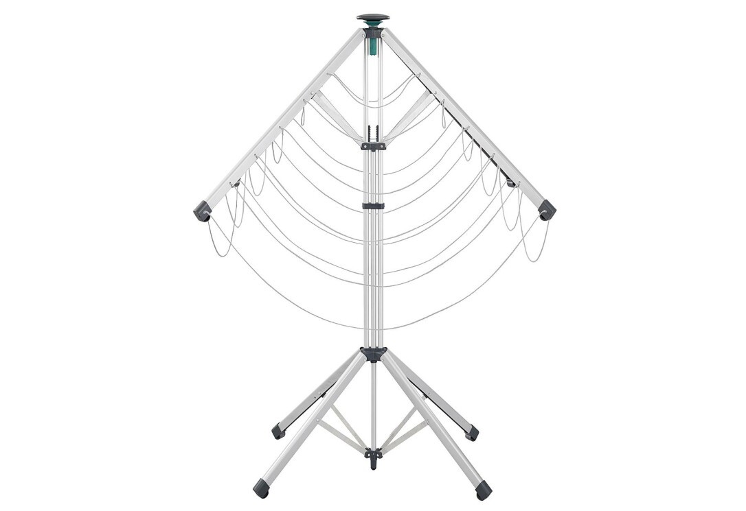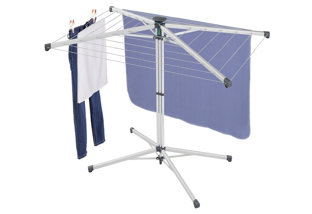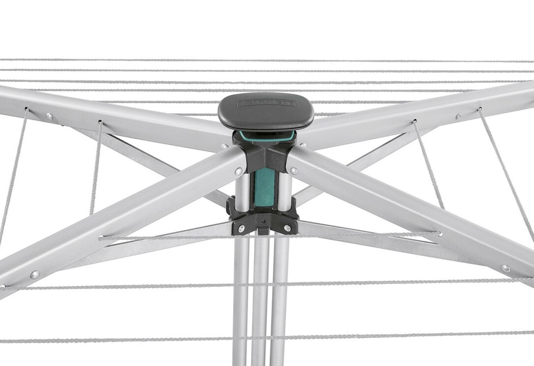 Die Leinen sind von innen nach außen leicht abfallend angeordnet, sodass man problemlos jede Leine erreicht. Mit einer Höhe von 95 cm bietet selbst die äußerste Leine die Möglichkeit lange Wäschestücke wie beispielsweise Badehandtücher oder Hosen zu trocknen. Dabei sorgen die stabilen Leinenarme und die breite Aufstellfläche, auch voll beladen, für einen sicheren Stand. Durch Druck auf den Bediengriff lassen sich die Leinen einfach und bequem nachspannen.