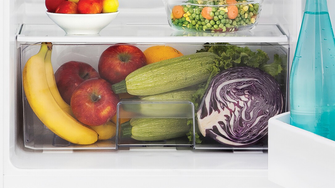 Einbaukühlschrank, kompakt, fügt sich in kleinste Küche ein. Das transparente Gemüsefach bietet viel Platz für die übersichtliche Einlagerung von Obst und Gemüse. Zudem ist es leicht zu reinigen. Das Gerät ist werksseitig mit rechtem Türanschlag ausgestattet. Mit der Möglichkeit, den Türanschlag zu wechseln, kann das Gerät immer optimal im Aufstellungsbereich bedient werden. Im 4-Sterne-Gefrierfach können frische Lebensmittel eingefroren und langfristig gelagert werden.