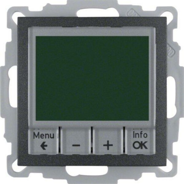 Temperaturregler, Schließer, mit Zentralstück, zeitgesteuert B.3/B.7 anthrazit, matt 230 V~, 50 Hz Temperatur-Einstellbereich Raum 5 - 30 Grad C Temperatur-Einstellbereich Fußboden 10 ... 40 Grad C Schalttemperaturdifferenz ca. 0,5 Grad C Schaltstrom 10 mA - 10(4) A Schaltstrom bei cos und phi, 0,6 max. 4 A Leistungsaufnahme ca. 1,2 W Gangreserve ca. 10 Jahre (Lithiumzelle) Einbautiefe 25 mm Neutralleiter erforderlich! - mit Aufdruck - für Heiz- oder Kühlbetrieb - für Raum- und Fußbodenheizungen - bei Fußbodenheizung, Regelung mittels Raum und/oder Fußbodentemperatur möglich - mit integriertem Temperaturfühler - mit zusätzlichem Anschluss für externen Fußbodentemperatur-/Fernfühler - großfl ächiges, hintergrundbeleuchtetes Display mit Textanzeige.