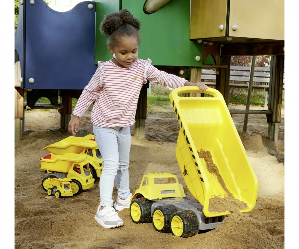 Im typischen gelb-schwarzen Baufahrzeug-Design und mit 6-Loch-Bereifung ist der Kipplaster der König auf der Baustelle - ob zu Hause, im Sandkasten oder auf dem Spielplatz. Die Konstruktion aus UV-beständigem Kunststoff und zusätzlichen Metallachsen schützt den Kipplaster vor Witterungseinflüssen und ist leicht zu reinigen. Einfach mit Wasser abspülen und schon können die Kinder weiterfahren.