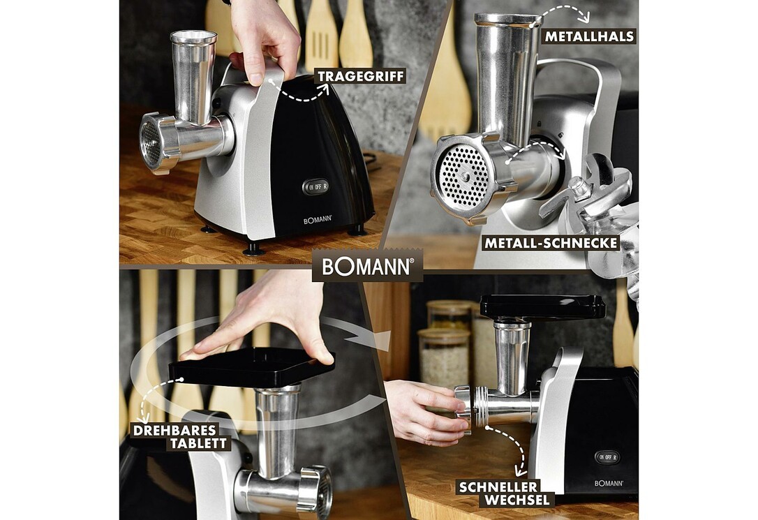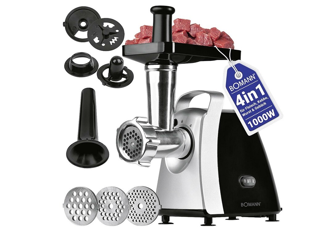 Der Bomann Fleischwolf FW 6067 CB ist ein leistungsstarkes Gerät, das Ihnen das schnelle Verarbeiten von großen Mengen Fleisch und Fisch ermöglicht. Mit der Vor- und Rücklauffunktion ist die Zubereitung von Hack (Tatar), Kebbe und Wurst ein Kinderspiel. Dank des drehbaren Einfülltabletts und des robusten Metallhalses ist die Handhabung mühelos. Die Maschine wird mit 3 Metall-Lochscheiben (fein, mittel, grob) und einem 4-flügeligen Edelstahlmesser geliefert, sodass Sie die gewünschte Konsistenz leicht erreichen können. Zusätzlich enthält sie einen Kebbeaufsatz für die orientalische Küche, einen Plätzchen-/Gebäckaufsatz für köstliches Spritzgebäck und einen Wurstfülleraufsatz. Der Bomann Fleischwolf FW 6067 CB steht sicher auf Ihrer Arbeitsfläche dank der Saugfüße und ist einfach zu transportieren, dank des Tragegriffs. Mit 1000 W max. Leistung ist er leistungsstark genug, um Ihre Küchenaufgaben mühelos zu bewältigen.