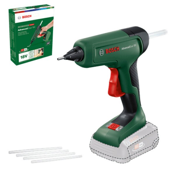 Bosch AdvancedGlue 18V. Produkttyp: Heißklebepistole, Produktfarbe: Grün. Leimausgabe: 20 g/min, Aufwärmzeit (min.): 90 s, Klebestiftdurchmesser: 1,1 cm. Energiequelle: Akku, Batteriekapazität: 2,5 Ah, Akku-/Batteriespannung: 18 V. Breite: 56 mm, Tiefe: 194 mm, Höhe: 184 mm