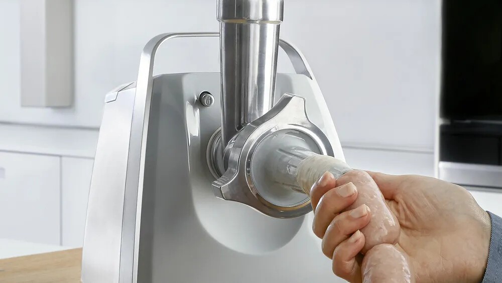 Fleischwolf, 500 Watt, Größe 5, leicht verstaubar, Große Einfüllschale, handlicher Stopfer, Ersatz-Mitnehmer, Sicherheits-Schnell-Kupplung, Hohe Standfestigkeit durch Gummifüße, Enthaltenes Zubehör: Integriertes Ordnungssystem für Zubehör, Kebbe, Wurststopfer