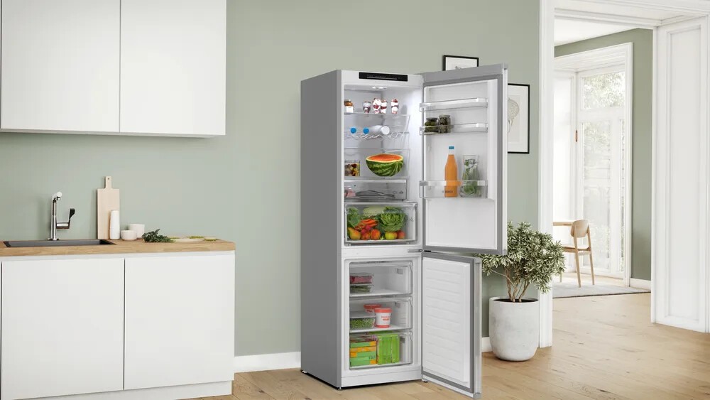 Diese freistehende Kühl‑Gefrierkombination mit Gefrierbereich unten bietet einen Gesamtnutzinhalt von 321 Litern und kombiniert energieeffizienten Betrieb der Klasse A mit einem sehr leisen Geräuschwert von 30 dB. Die No‑Frost‑Technologie verhindert Eisbildung und Kondenswasser, wodurch manuelles Abtauen entfällt. Zwei getrennt regelbare Kühlkreisläufe ermöglichen eine präzise Temperatureinstellung für Kühl‑ und Gefrierraum, während eine Frischhaltezone nahe 0 °C sowie eine separate Schublade mit Feuchtigkeitsregulierung die Haltbarkeit von Lebensmitteln verlängern. Eine gleichmäßige Kälteverteilung sorgt für konstante Temperaturen im gesamten Innenraum, ergänzt durch eine übersichtliche LED‑Innenbeleuchtung, flexible Glasablagen, Flaschenablagen und transparente Gefrierschubladen.