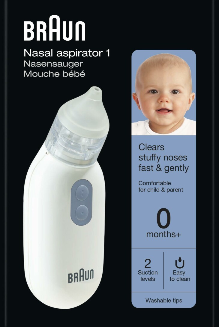 Nasensauger, mit zwei Saugstufen, befreit verstopfte Nasen schnell und sanft. Spülmaschinenfeste Teile garantieren einfache Reinigung. Der Sauger ist leise und einfach zu bedienen und angenehm für Kind und Eltern.