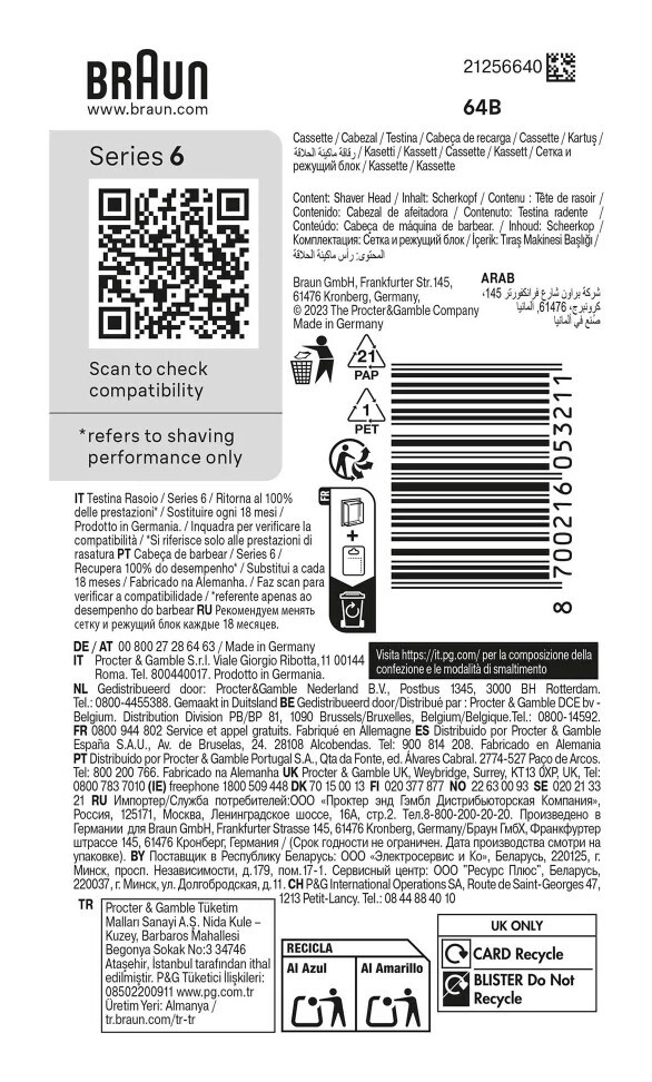 Braun Series 5 64 B. Produkttyp: Scherkopf, Zahl der Rasierapparatköpfe: 1 Kopf/Köpfe, Produktfarbe: Schwarz, Edelstahl