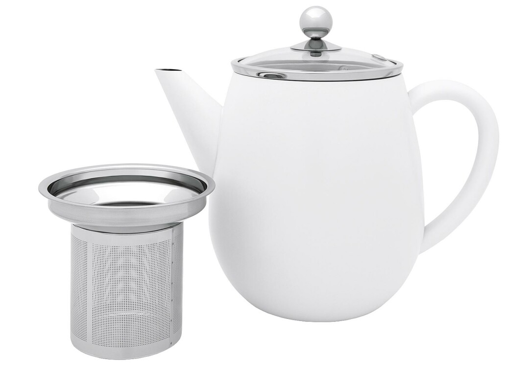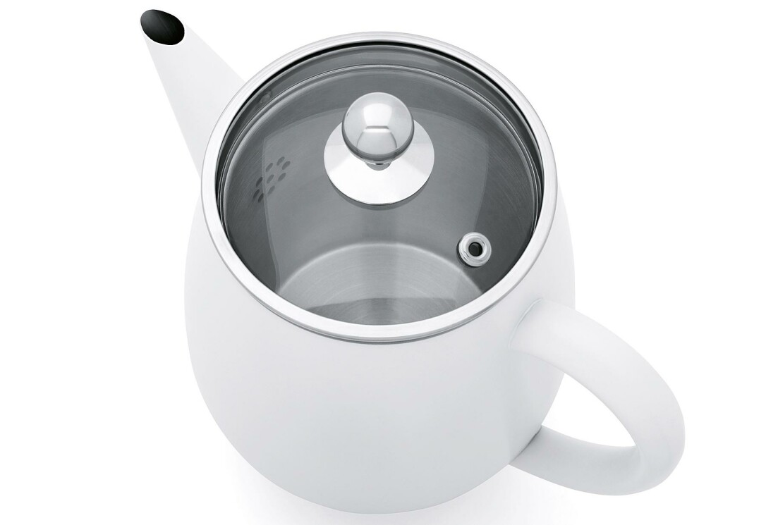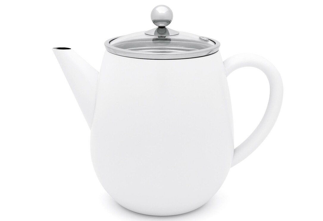 Bredemeijer Teekanne Duet "Eva". Die Teekanne Eva verfügt über eine doppelte Isolierwand. Der Tee bleibt hierdurch eine Dreiviertelstunde bis zu einer Stunde lang heiß und geschmackvoll (wenn die Teekanne mindestens bis zu 90 % gefüllt ist). Die Tülle hat ein besonderes Design und tropft beim Einschenken nicht. Der Griff und Deckelknopf werden allenfalls handwarm. 1,1 l, (LxBxH): 14,5x23x19,5 cm. Farbe: weiß matt.