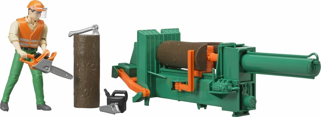 Woher kommt das Brennholz für den kuschelig warmen Kamin oder Kachelofen im Wohnzimmer? Mit dem Forstset können die einzelnen Schritte vom gefällten Baum bis zum Brennholzscheit spielerisch nachvollzogen werden. Aus den großen Baumabschnitten werden mit Hilfe der Kettensäge kleinere Abschnitte geschnitten, die sich dann mit dem Holzspalter in handlichere Scheite weiterverarbeiten lassen. Natürlich ist hier auch noch Muskelkraft gefragt. Nicht alles lässt sich mit der Kettensäge erledigen. Für diese Arbeiten sind die Axt und Handsäge gedacht. Der Arbeitsschutz steht beim ''Holzmachen immer im Vordergrund. Deshalb ist auch die Spielfigur mit einer Schutzweste und Helm mit Visier ausgerüstet. Die Arbeitsgeräte können die Figuren dank ihrer Greifhände sicher halten.