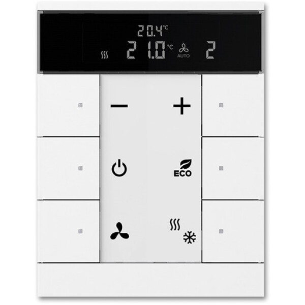 Frei konfigurierbares Multifunktionsbedienelement. Mit integriertem KNX-Busankoppler. Mit Beschriftungsfeld. Unterstützung der KNX-Funktionen durch innovatives Farbkonzept (gelb=Beleuchtung, blau=Jalousie, orange=RTR, magenta=Szene und weiß=neutral/keine Funktionszuordnung) oder Standardbeleuchtung rot/grün. Tasterfunktion: Schalten / Dimmen / Jalousie /Wert senden / Lichtszenen u.a. Zur Ansteuerung von Heizungs-, Lüftungs- und FanCoil-Aktoren. Master-/Slavebetrieb.