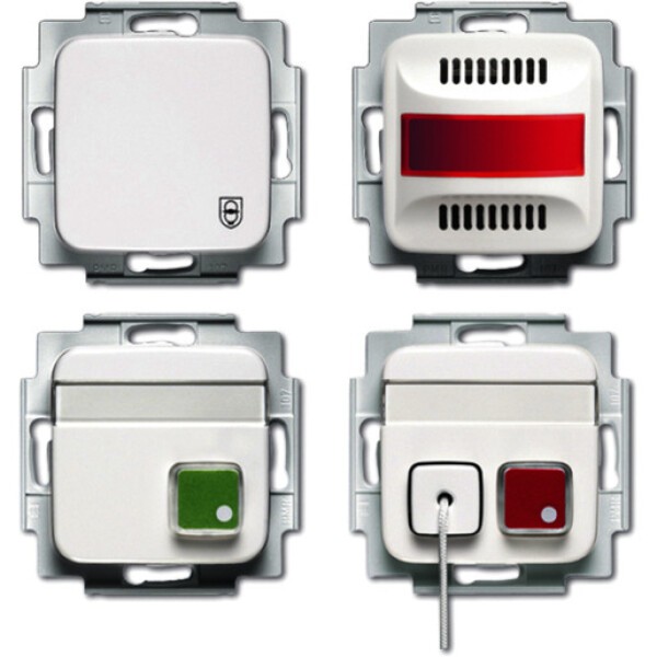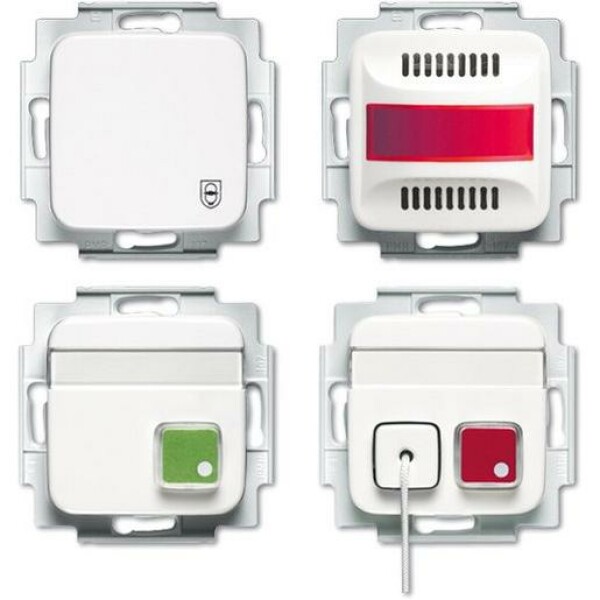 Zum Aufbau einer Notrufanlage für Behinderten-WCs. Bestehend aus: Netzteil-Einsatz, Alarmmelde-Einsatz, Signaltaster-Einsatz mit Zugschnur und Abstelltaster-Einsatz. Rufauslösung über Zugschnurtaster. Optische und akustische Notrufsignalisierung außerhalb des Behinderten-WCs. Beruhigungslicht bei Rufauslösung. Abstelltaster zum Aufheben des Notrufs. Beschriftungsfeld: 51 x 10 mm. Für Installationen nach DIN VDE 0834 wird eine Notstromversorgung benötigt.