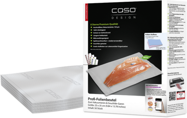 Profi-Folienbeutel 25 x 35 cm. Materialstärke 150 μm: Besonders stark und reißfest – auch bei spitzen Gegenständen, wie z.B. Knochen oder Gräten | Stabile Rippenstruktur für 100% Dichtigkeit | Schutz vor Gefrierbrand | Längere Haltbarkeit der Lebensmittel: Bis zu 8x länger frisch | Mikrowellengeeignet (bis 70 °C oder 8 min bei 950 Watt*) | Spülmaschinenfest und wiederverwendbar | SousVide-geeignet: Kochfest bis 100 °C für max. 8 Std. | mit gratis Food Manager Stickern zur Organisation und Lagerung Ihrer Lebensmittel.