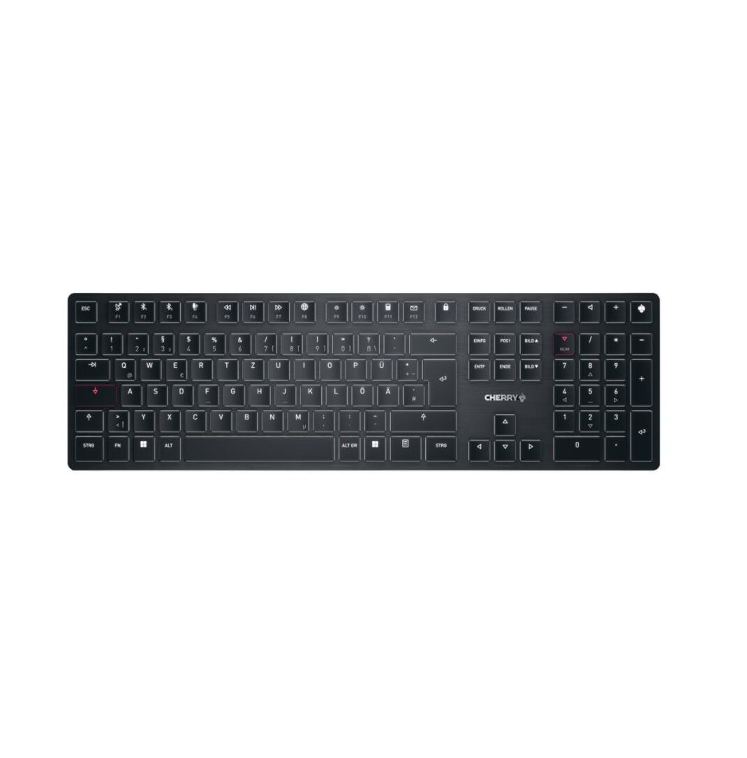 CHERRY KW X ULP. Tastatur-Stil: Gerade. Übertragungstechnik: Verkabelt & Kabellos, Geräteschnittstelle: USB + RF Wireless + Bluetooth, Tastatur-Switch: Mechanischer Switch, Tastaturaufbau: QWERTZ, Tastatur - Tastenanzahl: 111. Typ der Hintergrundbeleuchtung: LED. Kabellänge: 1,5 m. Empfohlene Nutzung: Universal. Produktfarbe: Schwarz