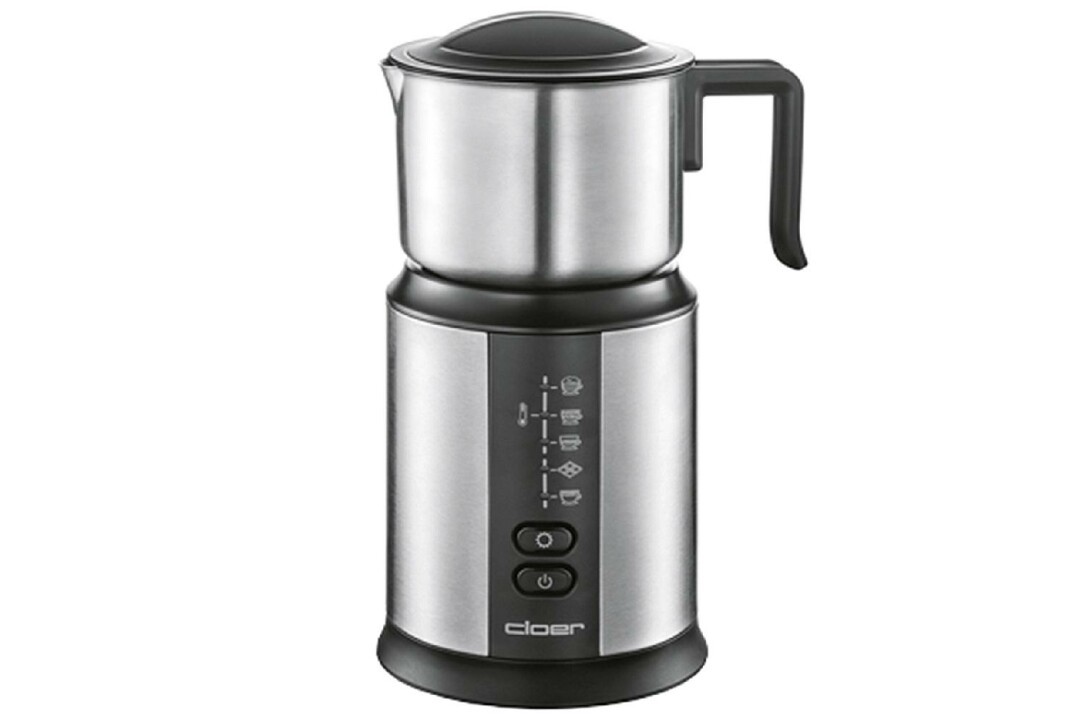 Funktionen: Latte Macchiato - Cappuccino - Cappuccino Plus - Hohe Temperatur - Kaltumrühr und Schoko, Moduswahltaste mit LED-Leuchten, Start-/Stopptaste und akustischer Fertigmeldung, Füllmenge für Milchschaum bis 250 ml, Heiße Schokolade bis 450 ml, Edelstahlkännchen mit Mengenmarkierung, Induktionsverfahren: gleichmäßige Wärmeverteilung und kein Anbrennen, Die Aufschäumspule wird durch einen Magneten zentriert, Spule haftet beim Ausgießen am Kännchen, Kännchen, Spule und Deckel spülmaschinengeeignet, Kabelaufwicklung und rutschfeste Gummifüße, Schwarz / silbernes Kunststoffgehäuse mit Edelstahlkännchen, Leistung 500 Watt