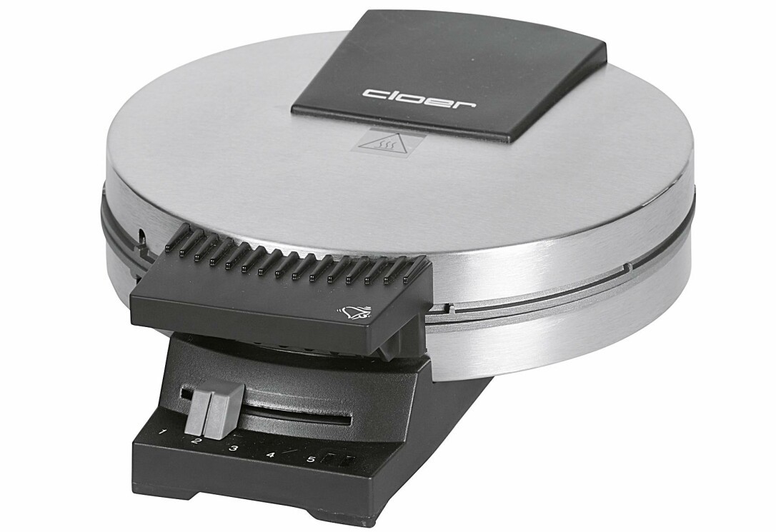 Der Waffelautomat Cloer 189 im mattierten Metallgehäuse dient zum optimalen Backen von kuchenartigen Waffeln. Die antihaftbeschichtete Backfläche mit 20 cm Durchmesser bietet ein fettarmes Backen. Der Bräunungsgrad kann mit einem Schieberegler an der Gerätefront stufenlos eingestellt werden und die optische und akustische Fertigmeldung gibt Auskunft darüber wann die Waffeln fertig gebacken sind. Das Scharnier an der Gerätefront des Waffelautomaten 189 ist flexibel, damit die Waffeln richtig aufgehen können. Der Waffelautomat 189 bietet eine platzsparende, auf den Griffen stehende Aufbewahrung.