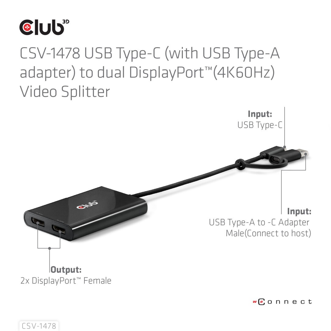 CLUB3D USB Type-C (with USB Type-A adapter) to dual DisplayPort™(4K60Hz) Video Splitter, USB Typ-C, 2x DisplayPort, Schwarz, 1 g, 32 g, 8473 3020