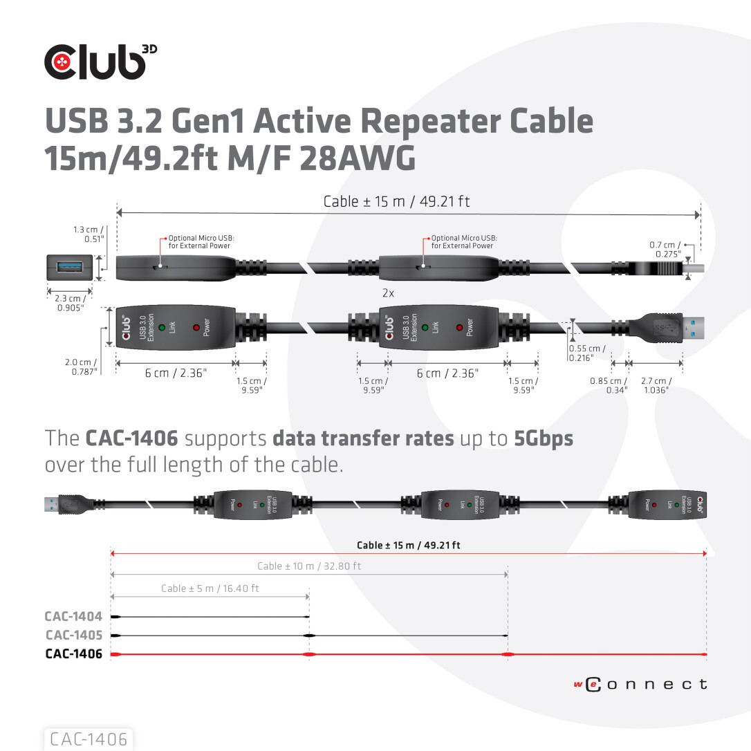 CLUB3D CAC-1406, 15 m, USB A, USB A, USB 3.2 Gen 1 (3.1 Gen 1), Schwarz