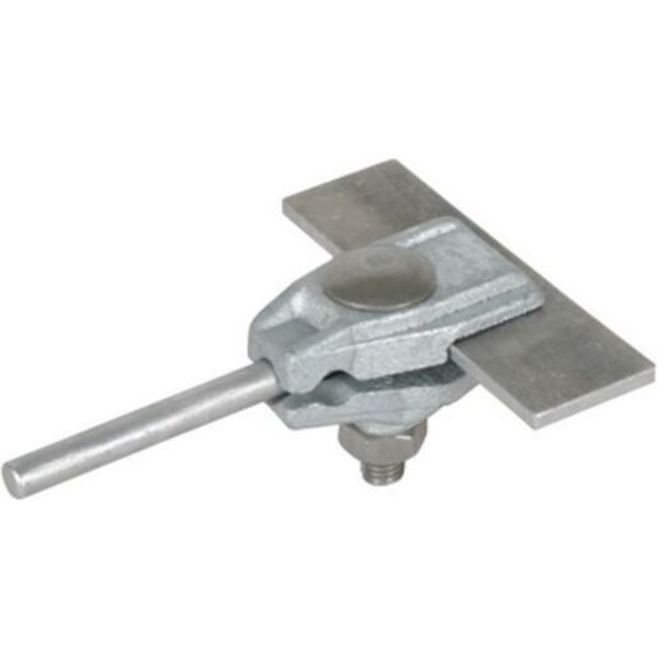 Anschlussklemme für den Anschluss an Stahlkonstruktionen und Stahlbleche. Anschluss längs oder quer Klemmbereich: 0,4-12 mm Werkstoff Klemme: TG/tZn Klemmbereich Rd: 7-10 mm Schraube: Flachrund M10x50 mm Werkstoff Schraube/Mutter: NIRO Normenbezug: DIN EN 50164-1