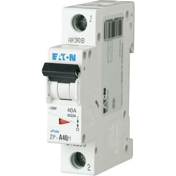Ausschalter, 1-polig, Bemessungsbetriebsstrom 40A, Bemessungsbetriebsspannung 230/400V AC, Bemessungsisolationsspannung 440V AC, Kurzschlussfestigkeit 3kA, Kappen-Einbaumaß 45mm, Einbaubreite 1TE (17,5mm), Hutschienenmontage, Klemmquerschnitt 1,5-25 mm², Ausführung entsprechend IEC/EN 60947-1, -3