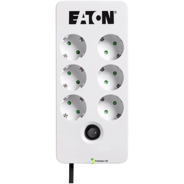 Protection Box mit 6 Schuko-Steckdose aus Kunststoff. Matte Oberfläche, mit Überspannungsschutz.