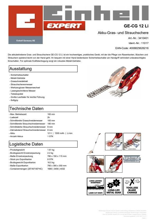Die akkubetriebene Gras- und Strauchschere GE-CG 12 Li ist ein hochwertiges, praktisches Gerät, mit der die Pflege von Rasenkanten, Büschen und Sträuchern spielend leicht von der Hand geht. Ihr bequem mit einer Hand bedienbarer Sicherheitsschalter am Handgriff verhindert unbeabsichtigtes Einschalten. Für optimale Kraftübertragung sorgt ein robustes Metall-Getriebe. Die hochwertigen, langlebigen Messer der GE-CG 12 Li sind lasergeschnitten, erzielen sehr gute Schnittresultate und lassen sich mit wenigen Handgriffen werkzeuglos wechseln. Das Gerät ist mit einem Grasschneideblatt und einem Strauchscherenmesser ausgestattet. Dank Teleskopstiel mit großen Laufrädern lässt sich die Grasschere mühelos und in aufrechter Körperhaltung führen. Dank Softgrip liegt sie angenehm griffig in der Hand.