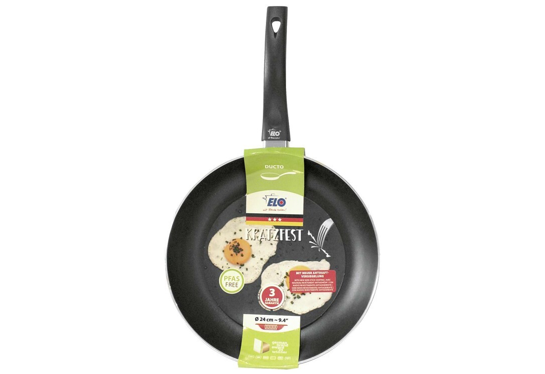 Leichtmetallartikel aus Aluminium. Wandstärke: ca. 2,8 mm. Bodenstärke: ca. 3,0 mm. Innen schwarz matte hochwertige, kratzfeste ELODUR® Select Antihaftversiegelung, außen schwarz glänzend Silikon Polyester beschichtet. Gelochter Induktionsboden 18/0. Stiel aus schwarzem Kunststoff und Aluminium Flammenschutz, verschraubt. Ränder abgedreht und poliert. Spülmaschinengeeignet. Für alle Herdarten geeignet, auch für Induktion. Verpackung: Farb-Banderole