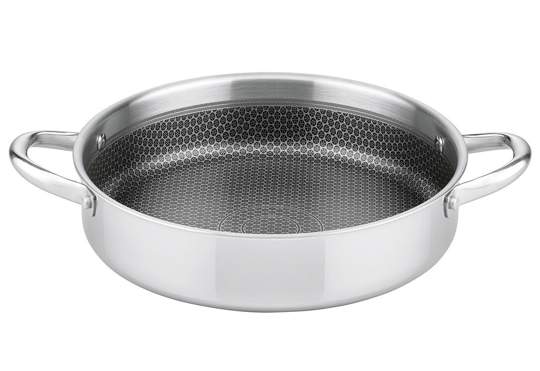 Servierpfanne "Relief Evolution" mit Griff aus Edelstahl Mehrschicht: innen Edelstahl 18/8 -18/10, durchgehender Aluminium-Kern, außen magnetischer Edelstahl, Gesamtmaterialstärke ca. 2,5 mm, außen hochglanzpoliert, innen satiniert mit Wabenboden: Ätzung ELODUR® Professional, die erhabene Edelstahlstruktur schützt die Antihaftversiegelung perfekt und ist kratzfest, ohne PFAS, für alle Herdarten geeignet, mit Öl-Dosiersystem (Oil Optimizer) garantiert einen reduzierten Einsatz von Ölen, gleichmäßige Wärmeverteilung vom Boden bis zum Rand, backofenfest bis 240 °C (mit Glasdeckel 180 °C). Maße: 3,6 l, Ø 28 cm, H 6,9 cm.
