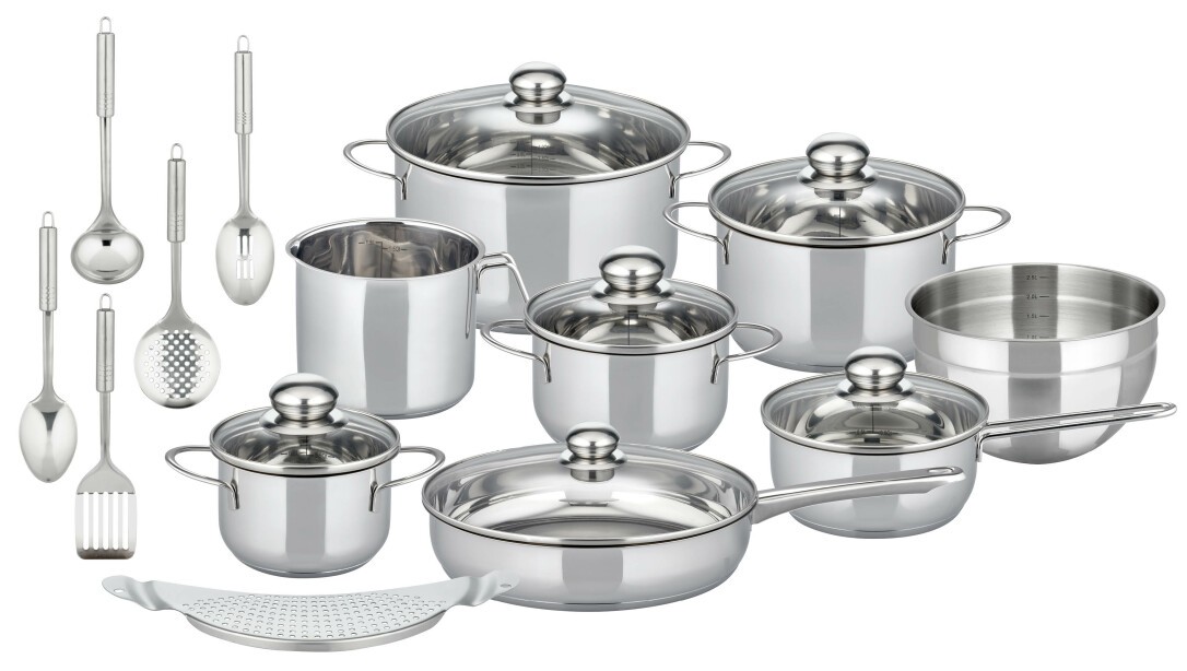ELO Topfset "Prima Tavola" 20-teilig. Inhalt: 5x Edelstahl-Küchenhelfer: Schaumlöffel, Schöpfkelle, Servierlöffel, Saucenlöffel, Schlitzwender, 1x Edelstahl-Schüssel 2,6 l, Ø 20 cm, je 1x Fleischtopf mit Glasdeckel 0,8 l, Ø 12 cm, 1,1 l, Ø 14 cm, 2,3 l, Ø 18 cm, 5,4 l, Ø 24 cm, 1x Stielkasserolle mit Glasdeckel 1,3 l, Ø 16 cm, 1x Milchtopf 1,6 l, Ø 14 cm, 1x Edelstahl-Abgießhilfe (passend für Kochgeschirre bis Ø 24 cm), 1x Pfanne mit Glasdeckel, Ø 28 cm, H 6 cm. Das Prima Tavola Topfset, aus dem ELO BASIC Programm, ist die ideale Komplettlösung für jede Küche. Mit seiner umfangreichen Auswahl an Töpfen, einer vielseitigen Pfanne und nützlichen Küchenhelfern erfüllt dieses Set sämtliche Anforderungen, die beim Kochen auftreten können. Ob für einfache Gerichte oder aufwendige Menüs – mit diesem Set sind Sie bestens ausgestattet. Die Edelstahl-Töpfe, Wandstärke ca. 0,5 mm, Gesamtbodenstärke ca. 2,4 mm, bestechen durch ihre hochglanzpolierte Innenseite, die zudem mit einer integrierten Volumenskala ausgestattet ist. Dies erleichtert das Abmessen von Flüssigkeiten direkt im Topf. Dank des Abgießrand können Flüssigkeiten sicher und tropffrei umgeschüttet werden, ohne dass etwas daneben geht. Die Töpfe sind mit einem Kapselboden ausgestattet, der für alle Herdarten geeignet ist, einschließlich Induktion. Dieser sorgt für eine gleichmäßige Wärmeverteilung vom Boden bis zum Rand. Der stoßfeste Edelstahlrand des Glasdeckels schützt vor Beschädigungen. Eigenschaften: energiesparender Kapselboden | spülmaschinengeeignet | backofenfest bis 180 °C mit Glasdeckel, bis 240 °C ohne Glasdeckel | für alle Herdarten geeignet.