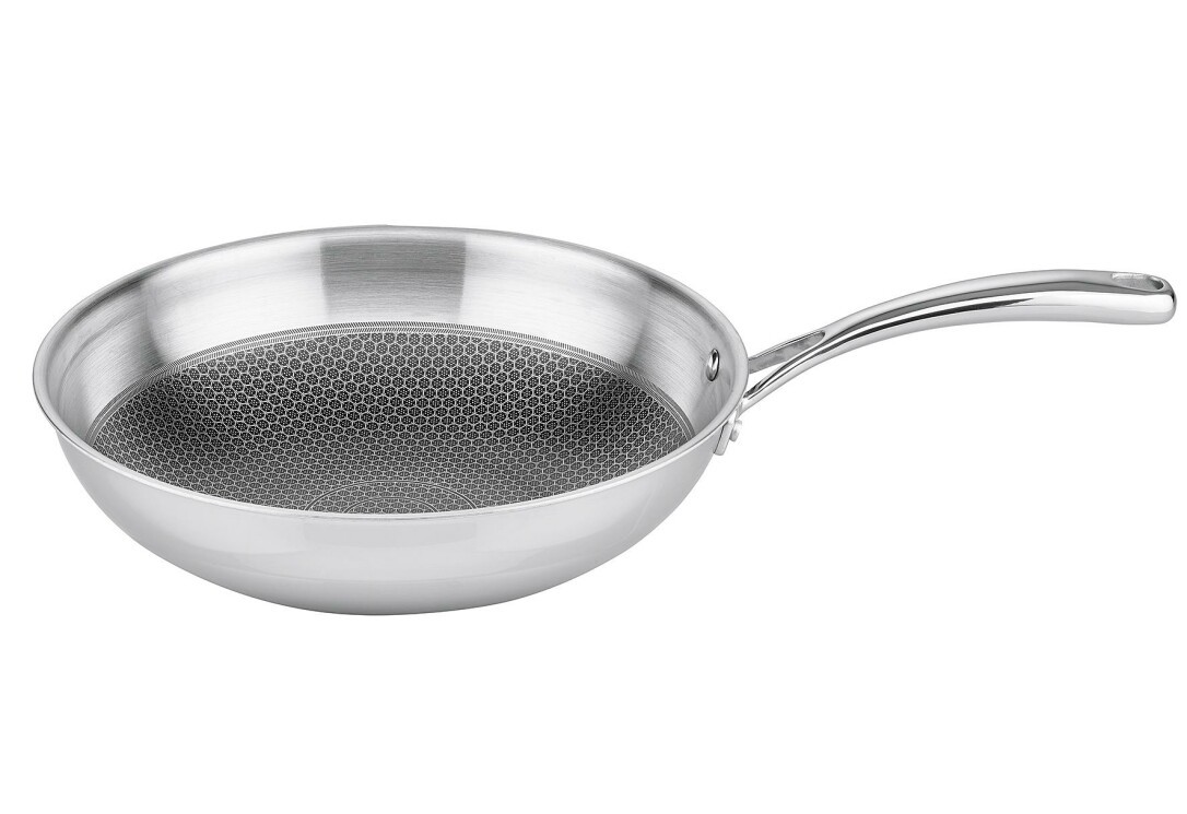 Wok- und Pastapfanne "Relief Evolution" aus Edelstahl Mehrschicht: innen Edelstahl 18/8 -18/10, durchgehender Aluminium-Kern, außen magnetischer Edelstahl, Gesamtmaterialstärke ca. 2,5 mm, außen hochglanzpoliert, innen satiniert mit Wabenboden: Ätzung ELODUR® Professional, die erhabene Edelstahlstruktur schützt die Antihaftversiegelung perfekt und ist kratzfest, ohne PFAS, für alle Herdarten geeignet, mit Öl-Dosiersystem (Oil Optimizer) garantiert einen reduzierten Einsatz von Ölen, gleichmäßige Wärmeverteilung vom Boden bis zum Rand, backofenfest bis 240 °C (mit Glasdeckel 180 °C). 3,8 l, Ø 30 cm, H 8 cm.