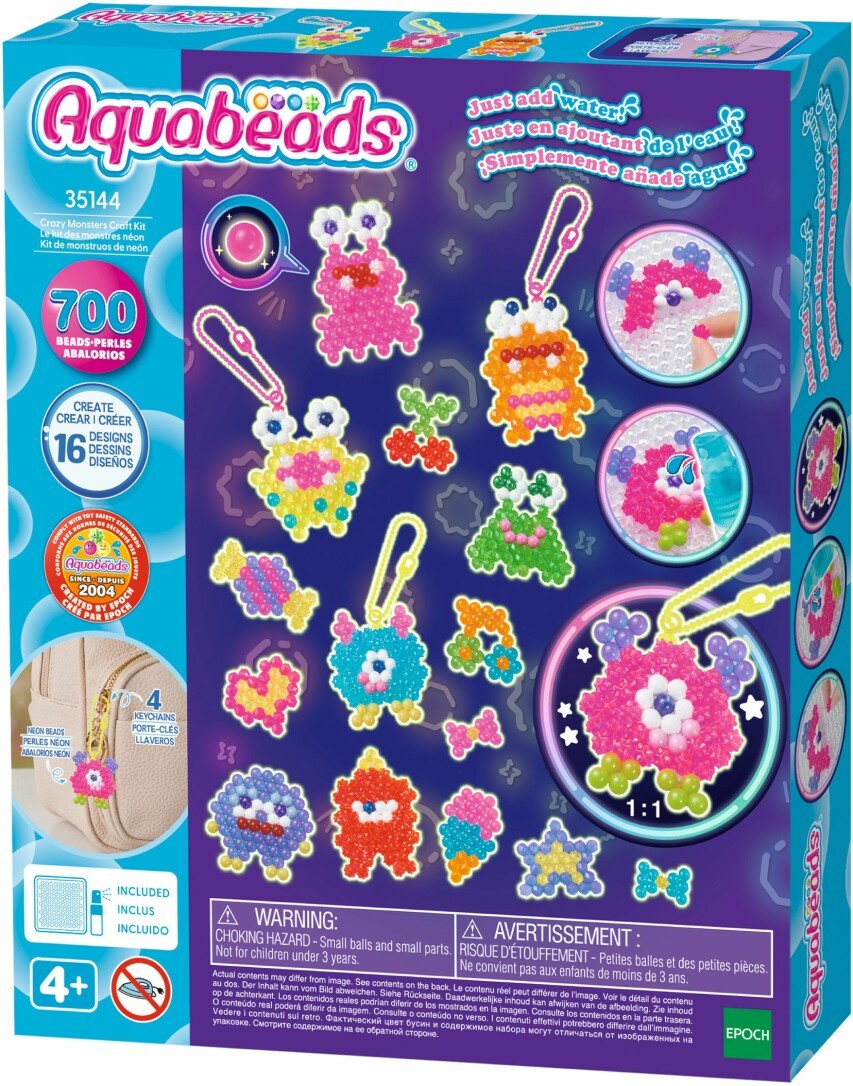 Auf ins kreative Monster-Bastelvergnügen mit dem Aquabeads Verrücktes Monster Bastelset! Das praktische Komplettset enthält 700 bunte Wasserperlen, darunter runde Perlen, Stern- und Glitzerperlen sowie die neuen Neon Perlen, eine Bastelplatte, Sprüher, Motiv-Vorlagen und Schlüsselanhängeradapter. Kinder ab 4 Jahren können die Perlen einfach auf der Bastelplatte platzieren und mit Wasser fixieren ganz ohne Bügeln oder Kleben! So entstehen bunte Monsterkreationen, die sich spielend in coole Schlüsselanhänger verwandeln lassen.