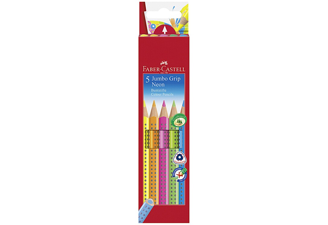 Faber-Castell Farbstifte Jumbo Grip Neon 5er Kartonetui. Menge pro Packung: 5 Stück(e), Schreibfarben: Blau, Grün, Orange, Pink, Gelb, Material: Holz