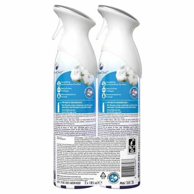 Febreze Lufterfrischerspray mit geruchsbekämpfender Technologie bekämpft Gerüche und hinterlässt einen leichten Frischeduft. Der Duft „Reine Frische“ wurde von der Frische purer, weißer Baumwolle inspiriert. Febreze Lufterfrischersprays sind nicht entflammbar und enthalten 100% natürliches Treibgas.