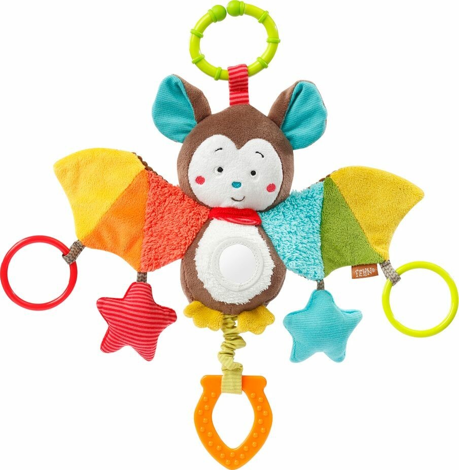 Lustiger Spielspaß ob Zuhause oder unterwegs: Mit dem praktischen Ring kann das Activity-Spieltier Fledermaus aus der Classic Stars Kollektion an Kinderwagen, Babyschale oder Bett befestigt werden. Die verschiedenen Spielmöglichkeiten sorgen überall für gute Laune: Vibrationsrassel, Beißer, Rassel, Quietsche, Raschelpapier und Greifringe regen die Neugier an und fördern Babys Greif- und Tastsinn sowie die Feinmotorik, der kleine Spiegel trägt zur positiven Entwicklung der Ich-Wahrnehmung bei - damit wird die spannende Fledermaus schnell zur besten Freundin des Babys.