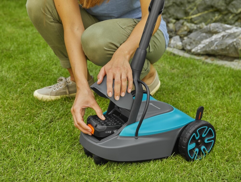Der perfekte Akku-Rasenmäher für kleine Gärten mit bis zu 50 m² Rasenfläche: Gardena Akku-Rasenmäher HandyMower 22/18V P4A Set