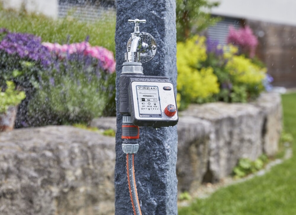 Mit der GARDENA Bewässerungssteuerung Master lässt sich die Bewässerung besonders flexibel und individuell planen. Bis zu sechs unterschiedliche und unabhängige Zeitpläne können erstellt werden. Die Steuerung ist batteriebetrieben, wird direkt an den Wasserhahn angeschlossen und lässt sich leicht durch nur einen Dreh- und Drückschalter zur Auswahl der Daten und zur Bestätigung bedienen. Ein gut lesbares, vollgraphisches LC-Display zeigt alle Einstellungen auf einen Blick an. Das Menü ist in 10 Sprachen wählbar. Die wetterbeständige Bedieneinheit ist abnehmbar. Die zentrale Anpassung der Bewässerungsdauer oder ein Pausieren aller Bewässerungen bei einer Schlechtwetterphase ist leicht möglich. Das Gerät eignet sich ideal zur Steuerung des GARDENA Wasserverteiler automatic. Die Bewässerungssteuerung Master kann auch in Kombination mit einem GARDENA Bodenfeuchtesensor eingesetzt werden.