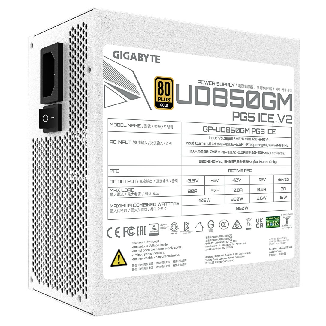 GIGABYTE UD850GM PG5 V2 ICE Netzteil – PCIe Gen 5.1, 80 PLUS Gold, Vollmodulares Design, 120-mm-Lüfter, ATX 3.1-kompatibel, EU-Stecker, 850 W, 100 - 240 V, 50/60 Hz, 12 - 6.5 A, Aktiv, 105 W