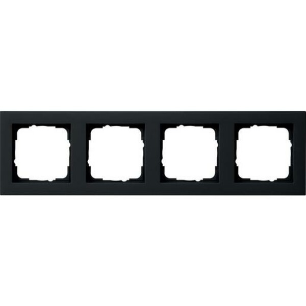 Abdeckrahmen Gira E2. Farbe: Schwarz matt, 4-fach. Merkmale: Bruchsicher. Hinweise: Auch für Kanalinstallationen geeignet. Abdeckrahmen (1- bis 5-fach) in Verbindung mit Dichtungsset auch für die Montage wassergeschützt Unterputz IP44 geeignet.