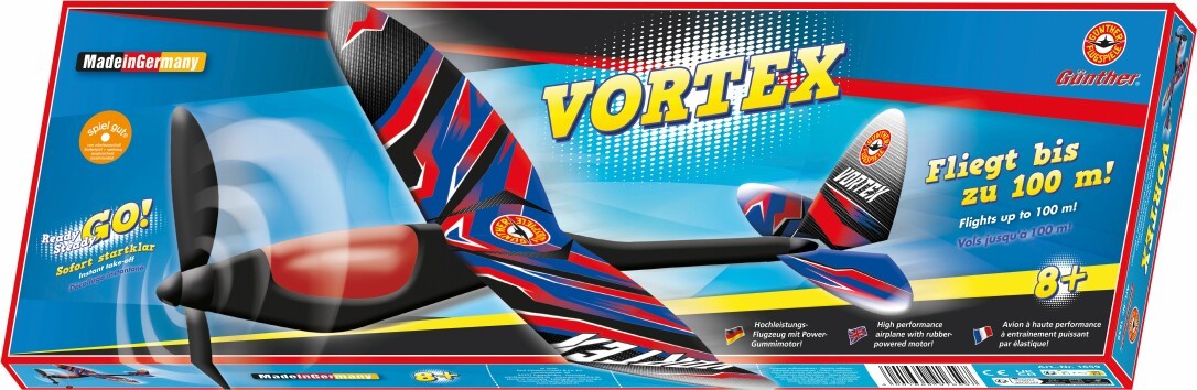 Hochleistungs-Flugmodell mit Power-Gummimotor. Fantastisch einfach: Fliegen mit der Kraft eines aufgedrehten Gummibandes. Der Gummimotor ist wohl die einfachste und natürlichste Kraftquelle, Flugmodelle über längere Zeit in der Luft zu halten. Durch die ausgezeichneten aerodynamischen Flugeigenschaften kommt die Kraft des aufgedrehten Gummibandes voll zur Geltung. Kraftvoll starten die Flieger durch, kuppeln am Ende der Laufzeit den Freilaufpropeller aus und landen elegant segelnd am Boden. Sie brauchen nur das 'Aufladen' von Hand um die Power für weitere elegante Flüge zu 'tanken'. Fliegt bis zu 100 m weit. Mit hochwertiger Folienbespannung. Größe des Modells: ca. 49 x 50 cm. Für Kinder ab 8 Jahren. Made in Germany!