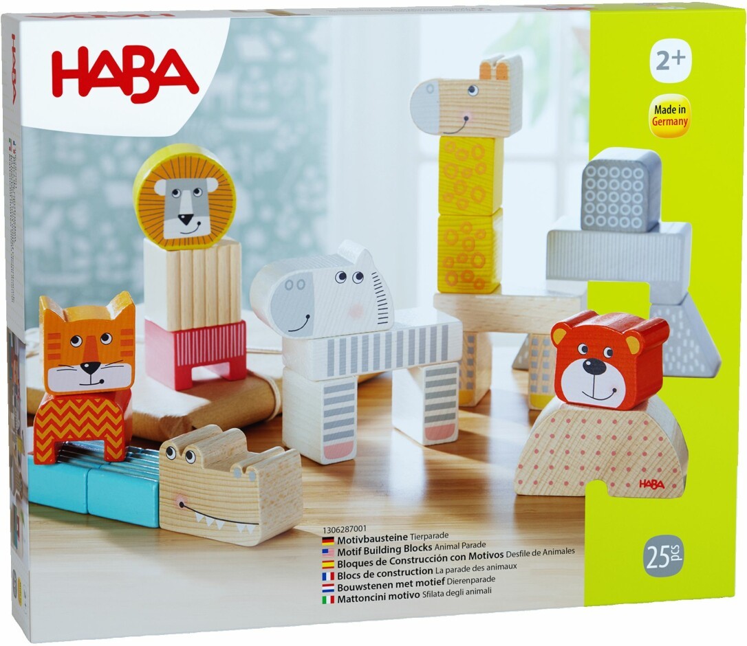 Giraffe, Löwe, Zebra & Co. stellen sich zur großen Tierparade auf und kleine Baumeister können ihnen dabei helfen! Aus den Bausteinteilen mit verschiedenen Farben und Mustern lassen sich die Tiere immer wieder neu und manchmal auch ganz durcheinander zusammensetzen. Das sorgt für jede Menge Spielspaß und fördert die Kreativität. Bietet vielfältige Bau- und Stapel-Möglichkeiten. Inhalt: 25 Baumsteine. Material Buche. Maße: Würfel 4x4x4 cm. Schult die Geschicklichkeit und Kreativität. Ab 18 Monaten.