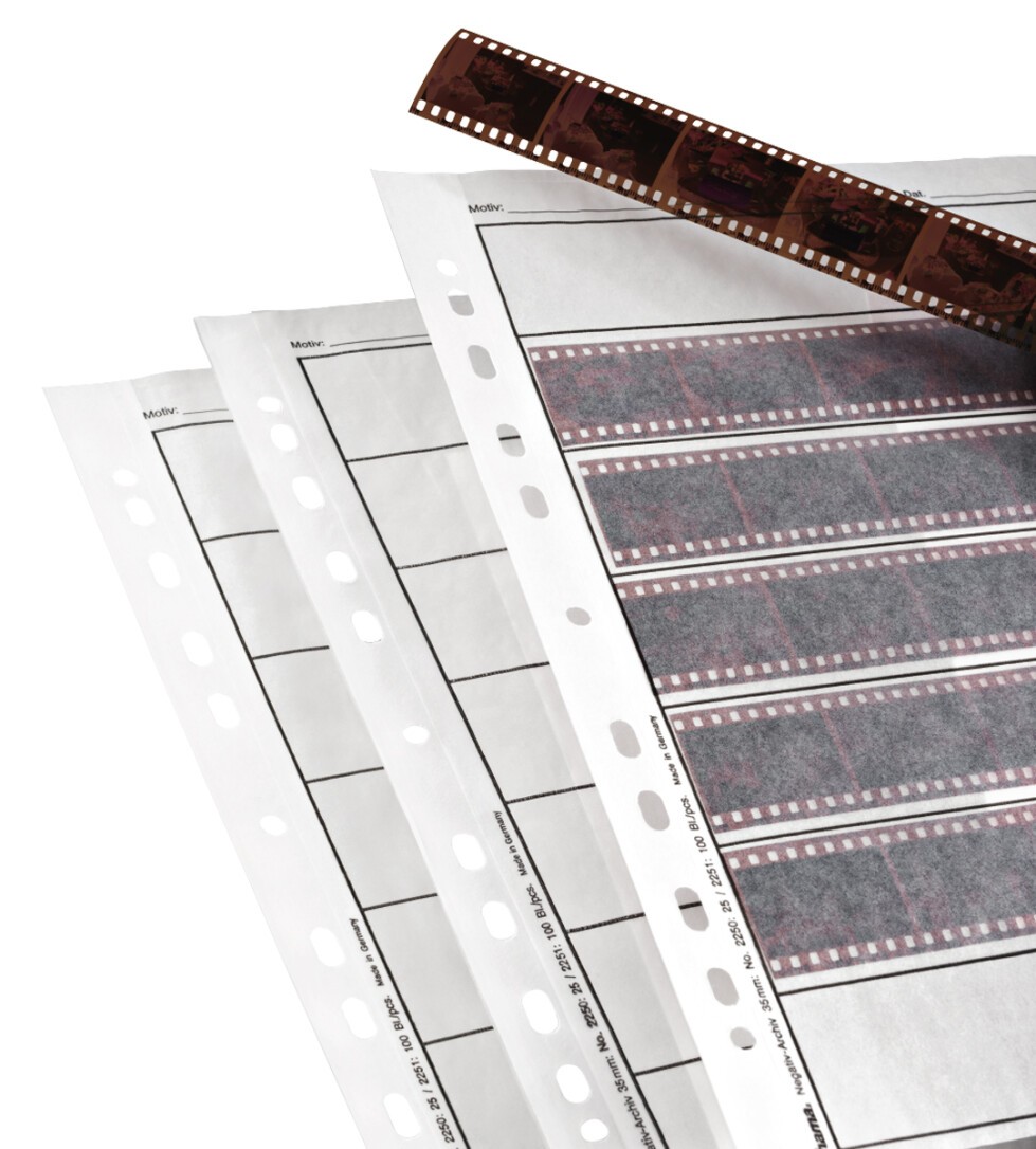 Hüllen zum dauerhaften und übersichtlichen Archivieren von Kleinbild-Negativen zum Schutz Ihrer wertvollen Negative vor äußeren Einflüssen wie Staub, Lichteinstrahlung, Feuchtigkeit. Die einzelnen Folienseiten sind versetzt zueinander angeordnet, so dass sich die Streifen mühelos einschieben lassen
