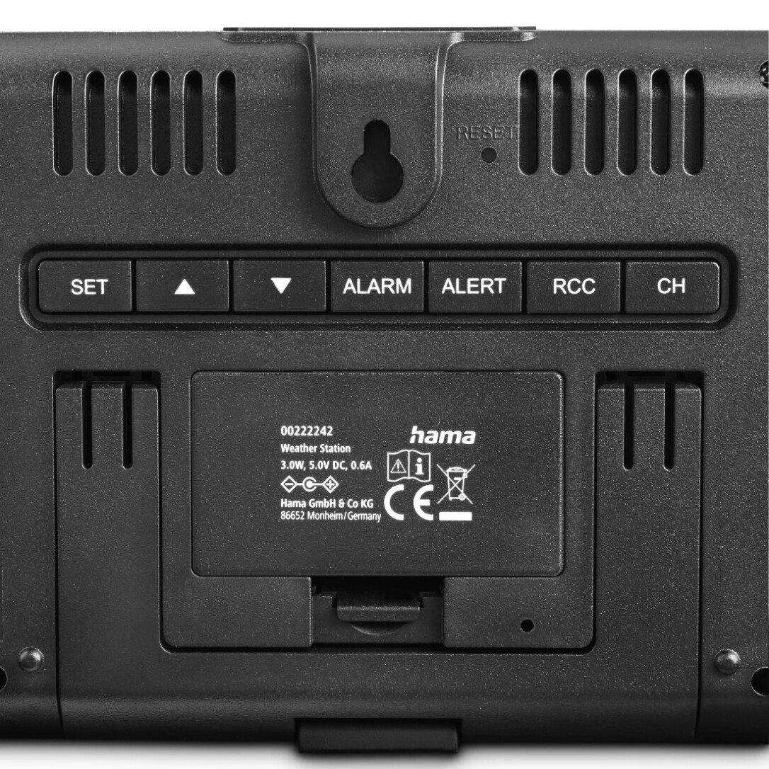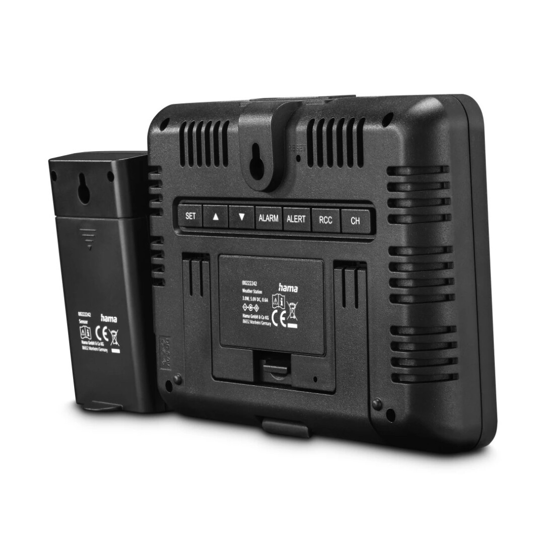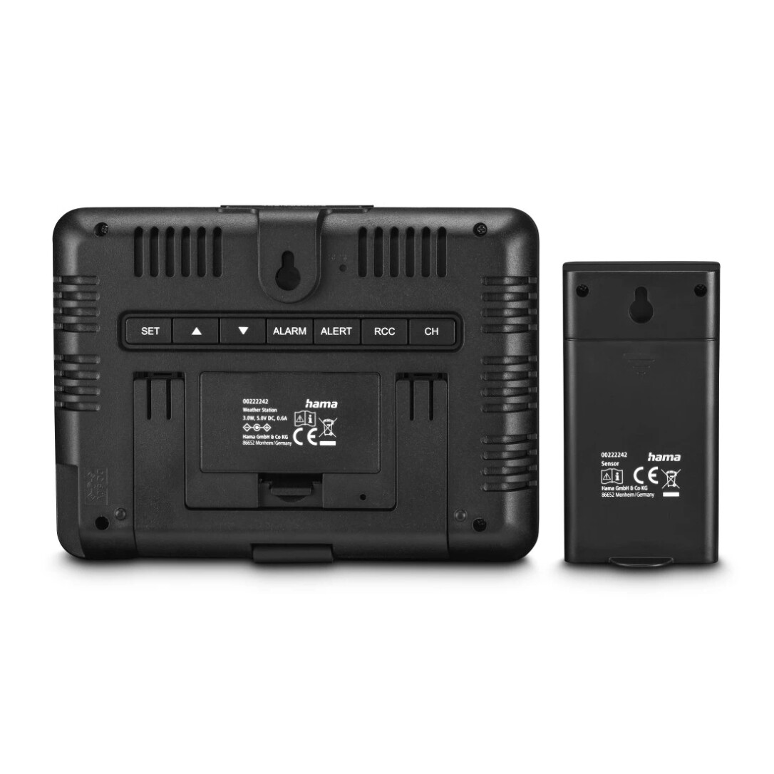 Hama Usedom. Produktfarbe: Schwarz, Messfunktionen: Innen-Hygrometer, Innen-Thermometer, Außen-Hygrometer, Außen-Thermometer, Messfunktionen Trenddisplay: Hygrometer, Thermometer. Energiequelle: AC, Akku-/Batterietyp: AA. Breite: 156 mm, Tiefe: 31 mm, Höhe: 114 mm. Menge pro Packung: 1 Stück(e), Anzahl enthaltener Akkus/Batterien: 2 Stück(e). Übertragungstechnik: Kabellos