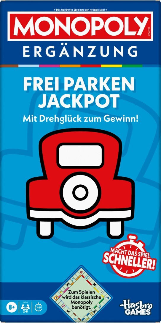 Mit Drehglück zum Gewinn! Die Monopoly Ergänzung ''Frei Parken Jackpot bringt neuen Schwung in das klassische Monopoly Spiel und verkürzt die Spieldauer auf die Hälfte. Die Teile dieser Ergänzung werden einfach an dem klassischen Monopoly Spielplan befestigt, und schon wird das Frei Parken Feld zu einem Jackpot. (Zum Spielen wird das klassische Monopoly benötigt. Separat erhältlich.) Die Drehscheibe bietet die Chance auf das ganz große Geld! Mit dem Dealmobil erhält die eigene Spielfigur ein Upgrade und Bonuskarten erlauben, Grundstücke kostenlos zu ergattern und mehr. Das Spiel endet, sobald alle Grundstücke im Besitz sind oder ein Spieler bankrott gegangen ist. Der reichste Spieler gewinnt! Diese spannende Monopoly Ergänzung kann bei einem Spieleabend oder in den Ferien hervorgeholt werden und bietet jederzeit kurzweiligen Spielspaß. Familienspiele und Brettspiele sind auch prima Geschenke für Kinder. Die Titel HASBRO und MONOPOLY sowie die dazugehörigen Logos, die Gestaltung des Spielplans, die vier Eckfelder, Name und Figur des MR. MONOPOLY sowie alle Elemente des Spielplans und des Spielzubehörs sind eingetragene Marken von Hasbro, Inc. für das MONOPOLY-Gesellschaftsspiel inklusive Spielausstattung.