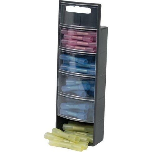 Das Set beinhaltet 20 Stk. Stossverbinder isoliert 0,5-1,0 shrink, 30 Stk.Stossverbinder isoliert 1,5-2,5 shrink und 10 Stk. Stossverbinder isoliert 4,0-6,0 shrink.