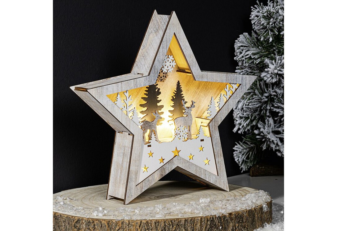 HI LED Holzstern batteriebetrieben, benötigt werden 2xAA, nicht im Lieferumfang enthalten. Material: Holz. Maße: (LxBxH): 25,5x5x25,5 cm.