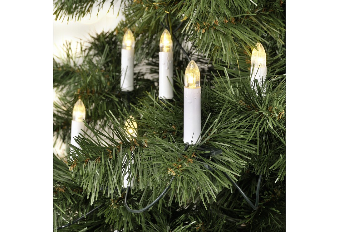 Christbaumlichterkette mit 20 warmweiße Kerzen LED, für den Innengebrauch, mit Klammern zur Befestigung am Weihnachtsbaum, Abstand zwischen den LED: 20 cm, Gesamtlänge: ca 5,30 m, Länge Zuleitung: 1,50 m, Kerzenhöhe ca. 7 cm (ohne Clip), CE/GS geprüft.