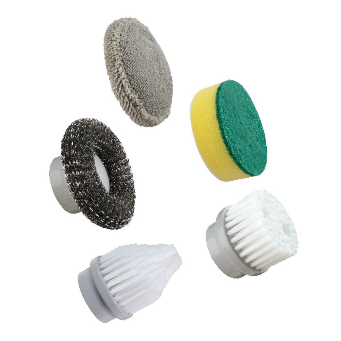 reinigt, poliert und schrubbt, 350 Umdrehungen pro Minute, fünf inkludierte Aufsätze von sanftem Mikrofaser-Polierer bis zur robusten Edelstahl-Bürste, wiegt nur ca. 400 g, kabellos, per USB aufladbar, Akkustand-LED-Anzeige, IPX7